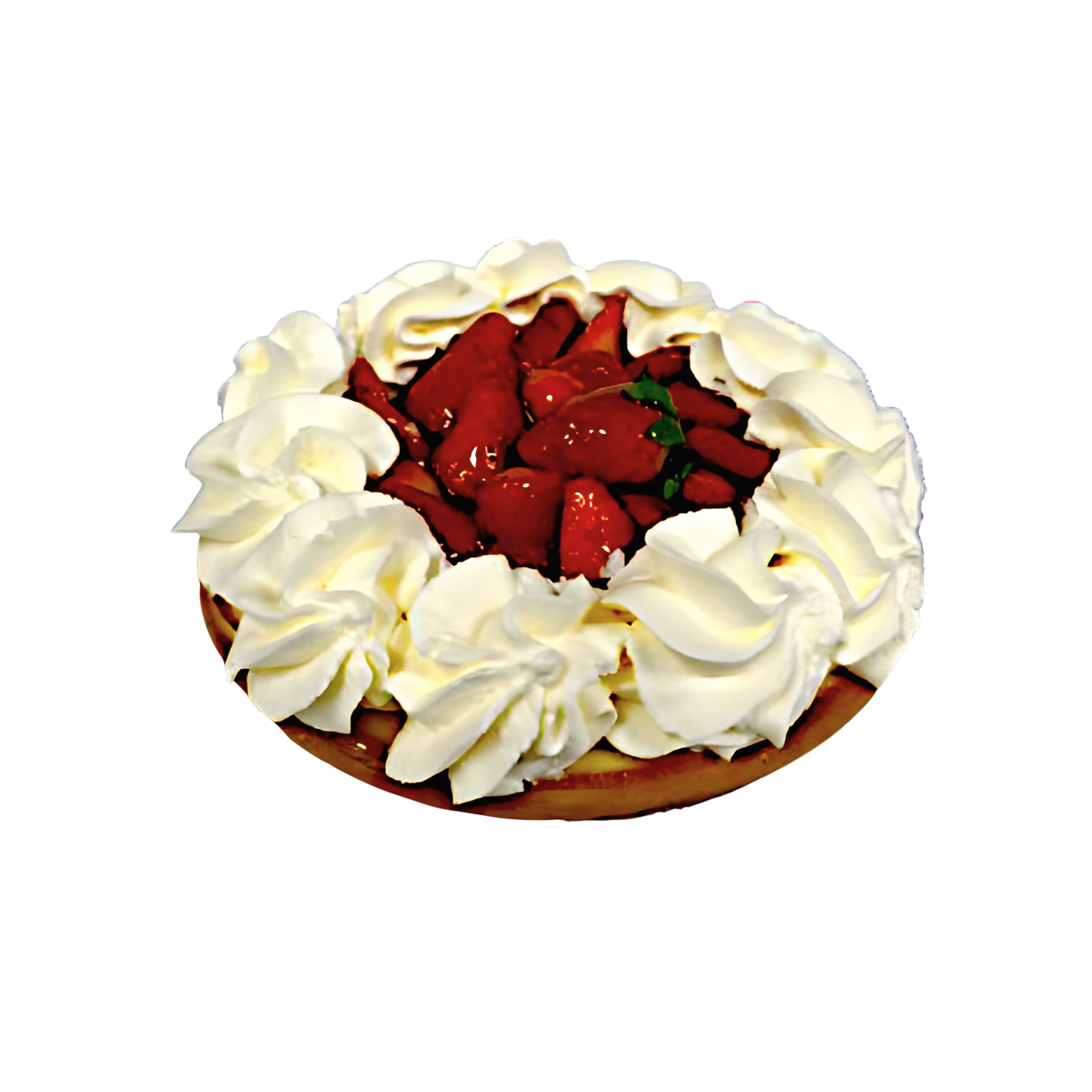 Heerlijk zachte vlaaibodem met banketbakkers room, verse aardbeien en slagroom.